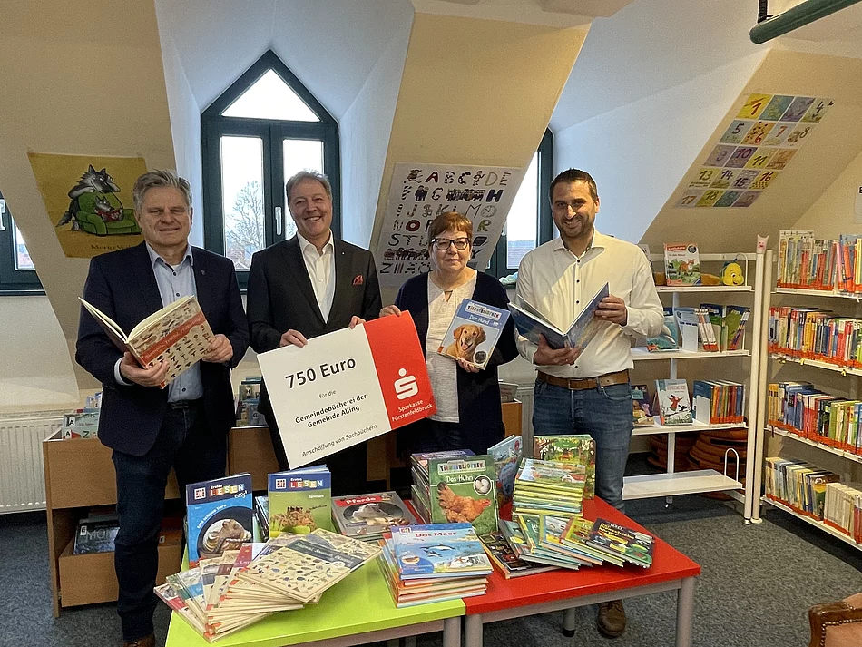 Vorstandsvorsitzender der Sparkasse FFB Frank Opitz (2.v.l.) überbrachte den symbolischen Spendenscheck an Büchereileitung Andrea Schlick. Der Spendenbetrag war erfreulich schnell eingegangen, sodass die neuen Bücher bereits angeschafft werden konnten. Gemeinsam mit Bürgermeister Stefan Joachimsthaler (li) und Amtsleiter Benedikt Friedinger (re) begutachtet er die neuen Bücherschätze.
