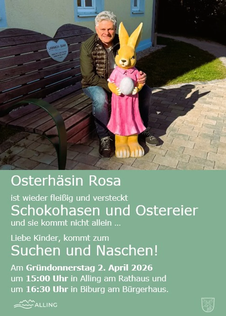 unsere liebe Osterhäsin Rosa hat mir versprochen, dass sie am Gründonnerstag wieder bei uns vorbeischaut. Und sie hat mir auch bereits verraten: Rosa kommt nicht allein! … ob ihr jemand vielleicht beim Eiertragen hilft? Oder beim Naschen? Kommt am Gründonnerstag, entweder ans Rathaus Alling um 15 Uhr oder später ans Bürgerhaus Biburg um 16:30 Uhr und lasst Euch überraschen!"