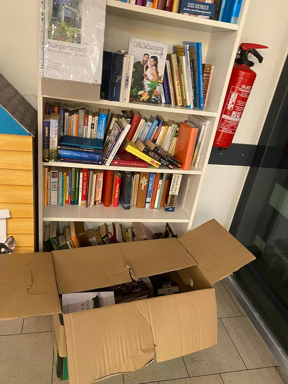 In diesem bedauerlichen Zustand finden wir unser öffentliches Bücherregal immer wieder vor: achtlos vollgestopft, Bücher in zwei Reihen hineingequetscht – oft mit Exemplaren, die niemand mehr haben möchte. Unansehnliche, beschädigte, verschimmelte Bücher oder alte Zeitschriften. Dazu sogar ganze Umzugskartons voller alter Bücher, einfach davor abgestellt.